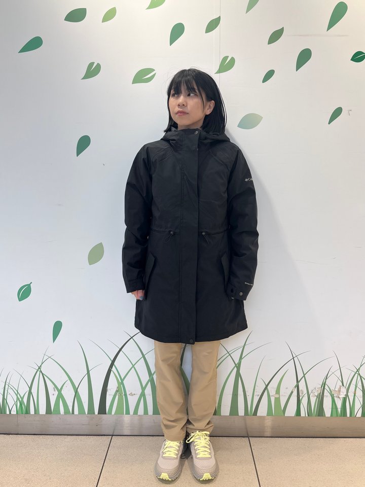 防水透湿機能を備えたアウターは、シームテープ処理で防水性を強化し、ウエストのドローコードでスタイルチェンジが可能となっており、ドロップテールで女性らしさをプラス。