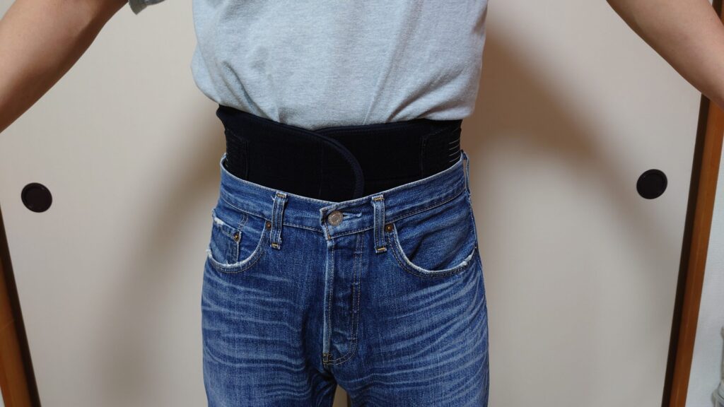 ソルボ楽らく腰ガードトリプルサポートを購入するまで使用していたコルセットです。これも分かりやすくするためズボンの上から装着しています。