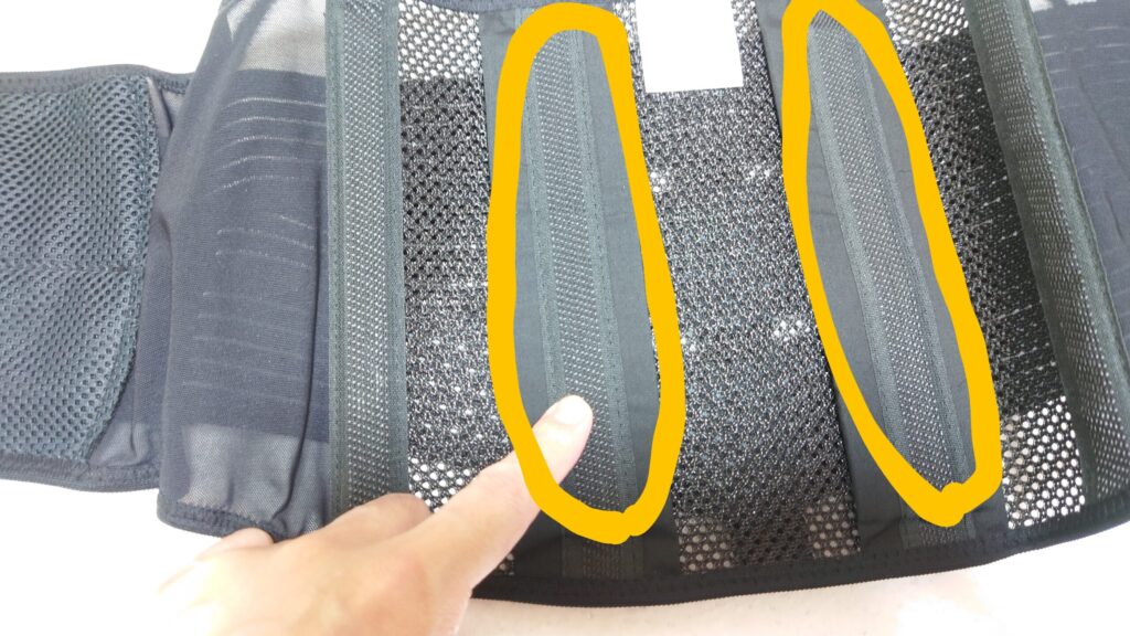 腰の両側と背中にある支柱(軟質ボーン)の内側(黄色〇部分)にソルボセインパッドが使用されているので、体にフィットしながらしっかりサポートをしてくれるのです。